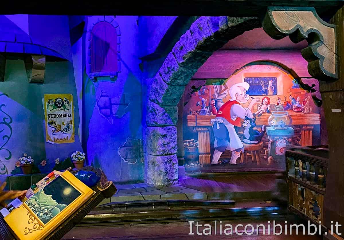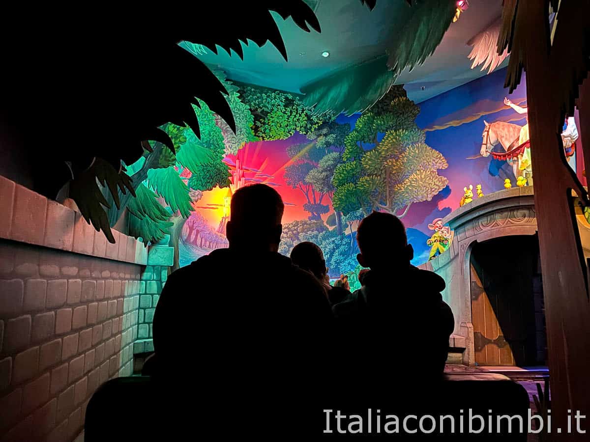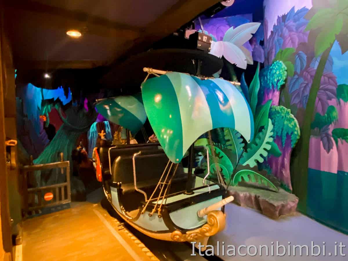 La sensazione è quella di volare perché i galeoni sono agganciati dall’alto, invece che scorrere su rotaia, come nelle altre attrazioni dedicate alle favole. Il buio potrebbe spaventare i bimbi più piccini ma non è comunque un’attrazione paurosa.