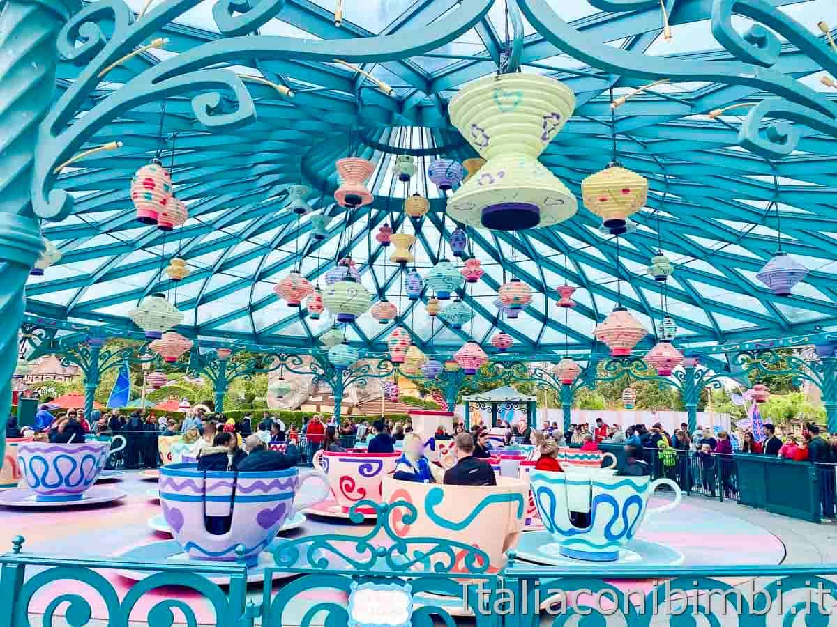 Tazze colorate a tema Alice nel Paese delle Meraviglie, attenzione girano velocissime, la ruota al centro permette di controllare un po’ la velocità ma comunque non si possono fermare e il fatto di girare su stessi può dare fastidio ad alcune persone.